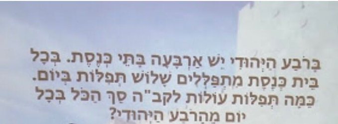 כמה תפילות עולות לקב"ה סה"כ בכל יום? שאלה במבחן מתמטיקה 5.04.2017 » הדיווח הבא: עמותת מרחביה מעצבת את דור המחר של ילדי גבעתיים שגדלים במציאות הישראלית הזקוקה להעמקת הזהות היהודית כאוויר לנשימה