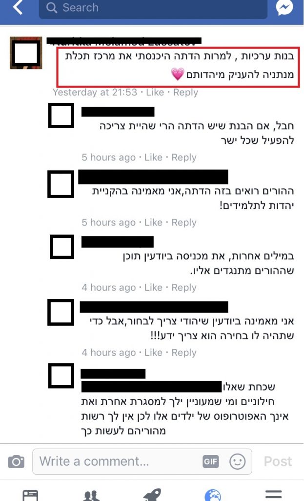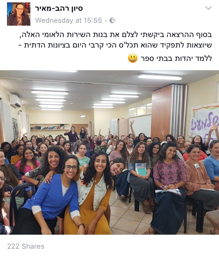 סיון רהב-מאיר, שאך לפני מספר שבועות גלגלה עיניה השמימה בהיתממות – "הדתה? ממה אתם מפחדים? קצת יידישקייט והיסטוריה ציונית זקופת קומה" חוזרת בה, וגאה להצטלם עם בנות שירות לאומי הנשלחות לקרב החשוב ביותר של הציונות הדתית – הדתה בבתי הספר החילוניים. אנו שמחים להיווכח שעוד מרצע יצא מעוד שק – למשל הציוצים והאמירות האחרונים של בנט – ושבעיני רהב-מאיר ובנות השירות הצעירות ילדינו הם האויב ולימודי ציונות והיסטוריה ומורשת של עם ישראל הם היהדות האמונית (וכמובן שלמותר לציין שזו היהדות רק שלהם לפי רוחם ורבניהם – לא רפורמים למשל או קונסרבטיביים רחמנא לצלן). לנו דווקא נראה שילדינו שבויים – ללא קרב – בידי שר חינוך מתנחלי-לאומני ובידי עושי דברו. זה לא יעבור.