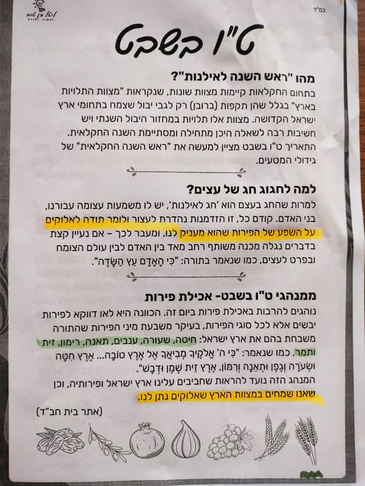 זה דף ששלחה לנו אמא ממרכז הארץ. כך מלמדים על ט"ו בשבט בכיתה ה' בבית ספר ממלכתי.