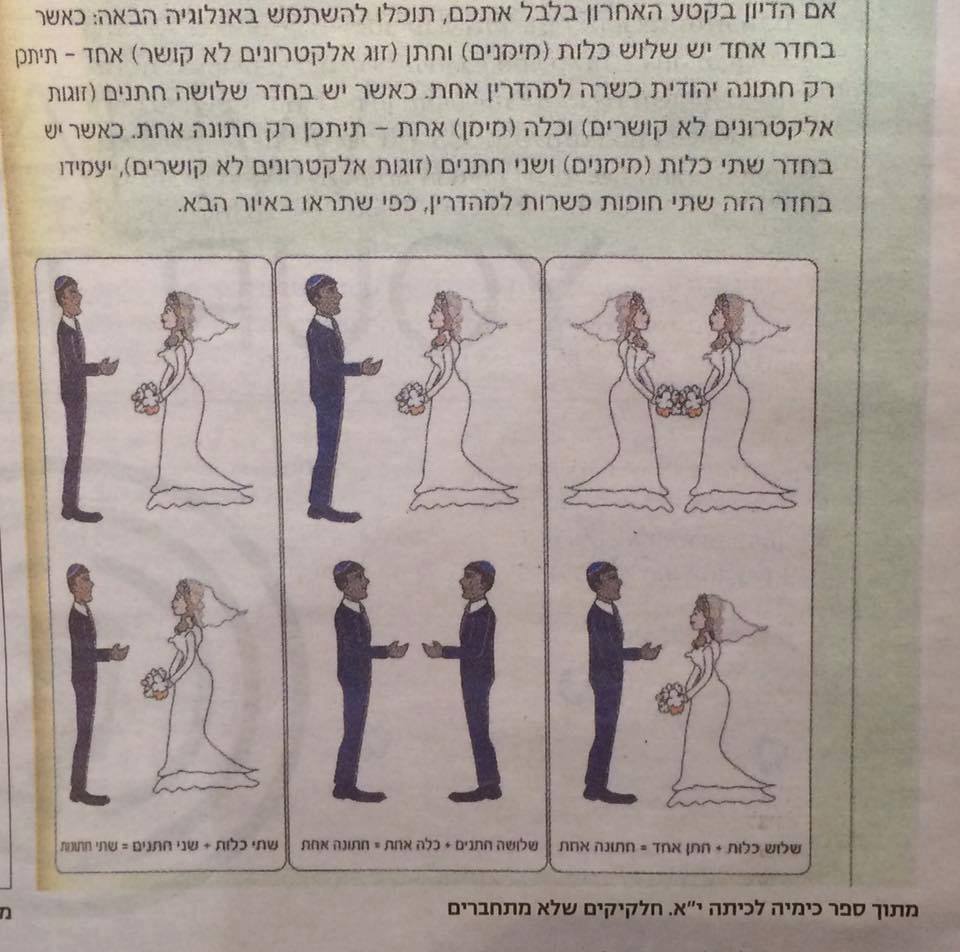 ספר כימיה לבי"ס ממלכתי – מספק דוגמה לקשרים מולקולריים אפשריים / לא אפשריים באמצעות השוואה לחתונות כשרות למהדרין. מי לא יכול להתחבר? גבר עם גבר או אישה עם אישה.